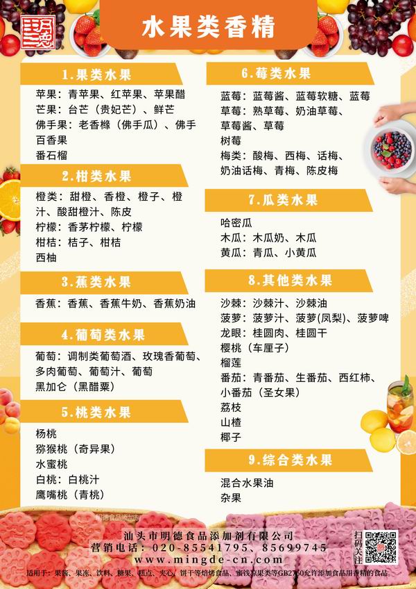 此外,汕頭市明德食品添加劑有限公司在數(shù)十年的研發(fā)中推出了眾多水果風(fēng)味香精,從草莓、芒果、橙子 到 沙棘、佛手果、獼猴桃,應(yīng)有盡有。歡迎廠家們了解嘗試~