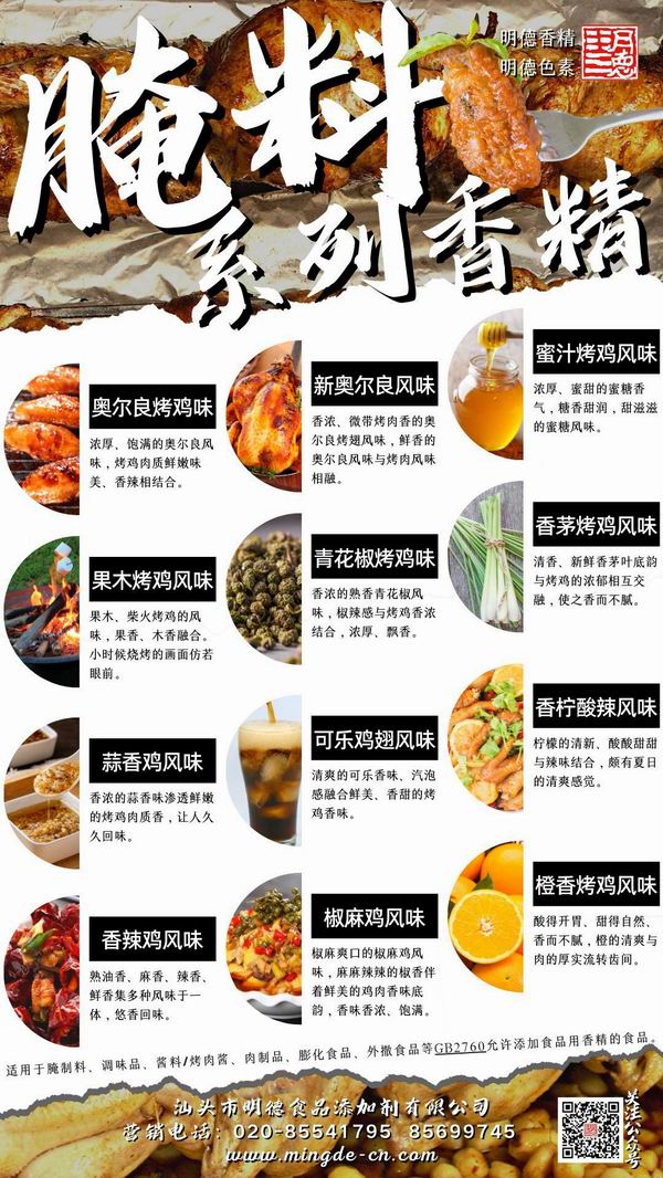 烤肉香精領(lǐng)域我們潛心專研,結(jié)合市場(chǎng)潮流,消費(fèi)者喜好,汕頭市明德食品添加劑有限公司現(xiàn)有多種烤肉相關(guān)風(fēng)味的香精,供您選擇。并持續(xù)努力研發(fā)更多符合市場(chǎng)需求的風(fēng)味。