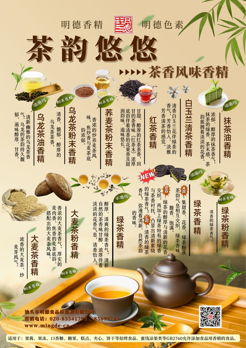 汕頭市明德食品添加劑有限公司推出的茶香風味系列香精,涵蓋烏龍茶、蕎麥茶、紅茶、白玉蘭清茶、抹茶、大麥茶、綠茶等多種茶類調(diào)性,滿足飲品、烘焙、糖果、乳制品、調(diào)味品等多領域的茶香需求,為B端客戶提供穩(wěn)定、真實的茶韻香氣解決方案。